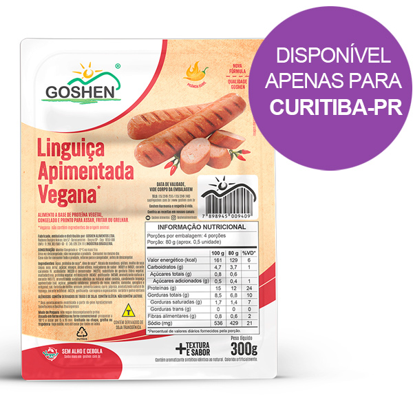 Linguiça apimentada vegana à base de soja. Uma opção rica em proteínas para o lanche ou refeições. Com ótima textura e sabor, tem um toque picante mas agradável, pode ser degustada assada, na feijoada vegana, como aperitivo, cobertura de pizzas, receheio de salgados e outros preparos.