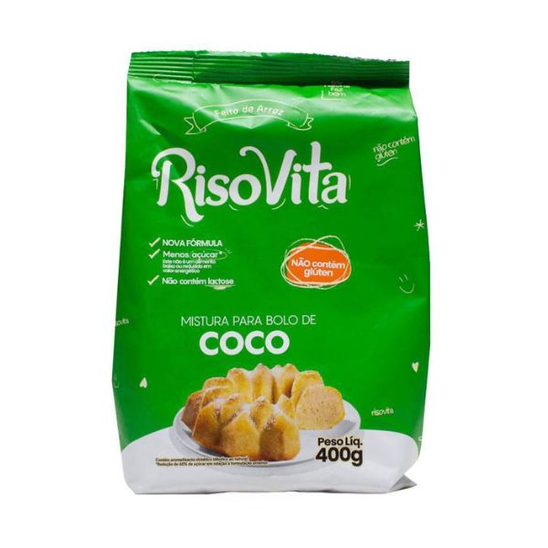 INGREDIENTES farinha de arroz, açúcar, coco ralado, fermento, goma xantana e aroma idêntico ao natural de coco. Não contém gluten.